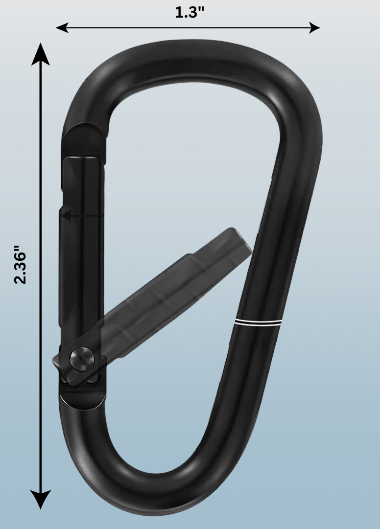 A lightweight black mini-carabiner designed to clip your Bottle2Bond travel case to a backpack, belt, cooler, or carry bag. Perfect for taking your glass anywhere—hands free.